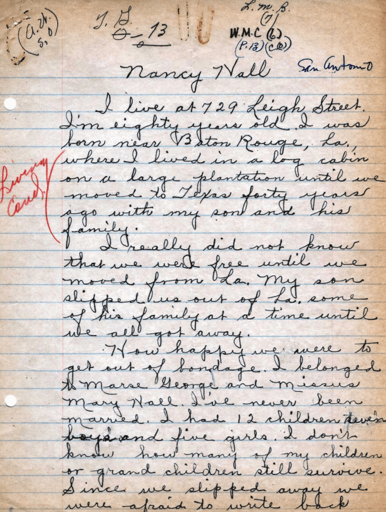 Nancy Hall stated that she was 80 years old during the interview and that she was born in Baton Rouge. She also acknowledges how she lived in a ‘log cabin’ on a quite large plantation before she moved with her son and his family. On a contextual note, log cabins were commonly occupied by enslaved people. After all, they were much more affordable to construct because they provided the minimum housing necessity that could accommodate other extended family members. This is important to consider because enslaved Black men and women in the Deep South were considered to be property. Therefore, planters attached their identity to the amount of physical labor they could exert. As a result, they were treated and viewed as inferior because their value was not tied to their humanity, but rather to how they could build the plantation economy thus accentuating white supremacist ideological structures. We can see this reflected in Nancy Hall’s testimony where she exclaims how she did not know that she was free until her son managed to move her out of Louisiana.