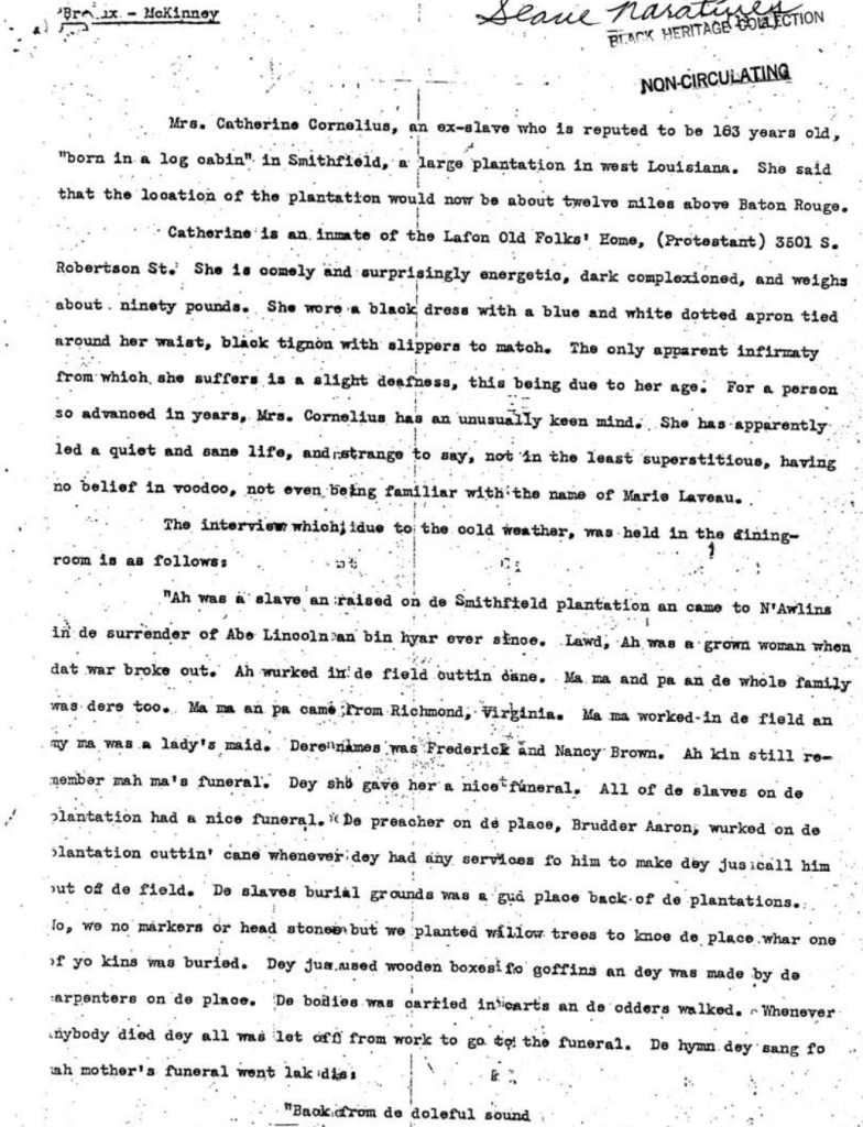 The life experience of the former enslaved woman, Mrs. Catherine Cornelius, is one that is unique and reflects the non-homogeneous nature of slavery. Her testimony was conducted by the interviewer Breaux McKinney between the years of 1940-1949. At the time of the interview, Mrs. Catherine Cornelius was 103 and was able to give an oral account of her past. Throughout her interview, a confident tone is expressed, and she is described as a woman who is both ‘energetic’ and has a dark complexion. Her story is important because it demonstrates how enslaved people valued community and religion even amid chaos and uncertainty.