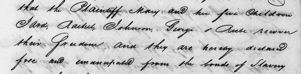 In the end, Mary’s courage to save herself and her children is rewarded. One of the final documents included in the case declares their right to freedom! Now upon hearing this, Mary could have been overwhelmed with joy and hope, relieved after five years of dealing with the legal system, or shocked that this was finally paying off. The Court declared, “the Plaintiff Mary and her five children Jar, Rachel, Johnson, George, and Robe recover their freedom and they are hereby declared free and emancipated from the bonds of slavery.” The conclusion of this case is an example of a time in our history when an enslaved person went up against people who had more social and financial capital and succeeded in gaining freedom for herself and her children.