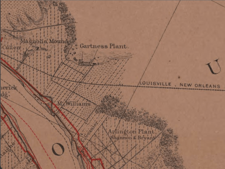 In this map, the Gartness Plantation buildings and slave cabins are featured. This map also features the Louisville, New Orleans, & Texas Railroad. In 2021, when looking at the relation of the railroad line, one can locate Tiger Stadium. Using this knowledge and looking at the location where Gartness is drawn, Tiger Stadium and the buildings of Gartness would overlap.