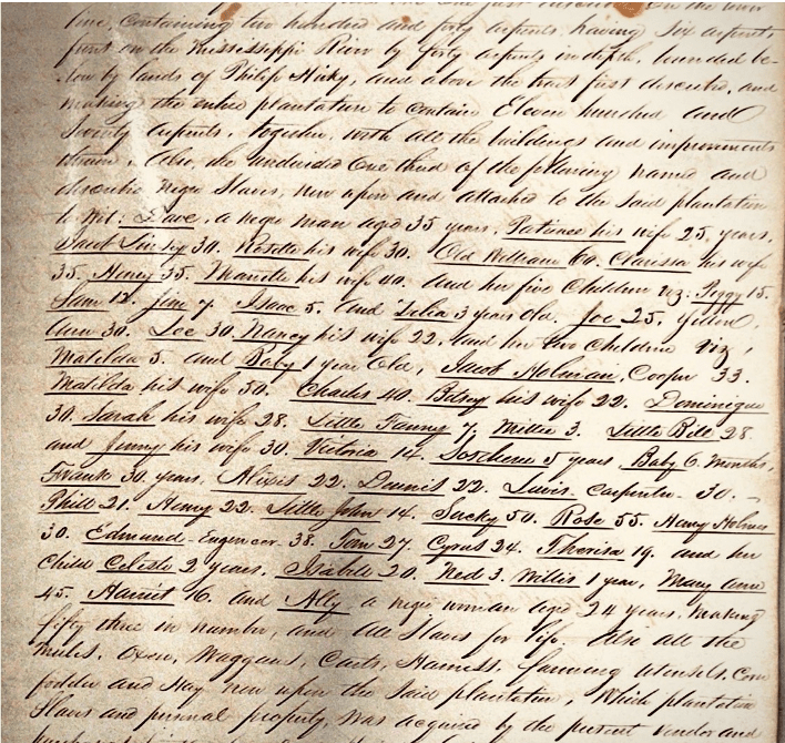 Over the years, Arlington Plantation was owned by different planters. In the 1830’s, Dr. John C. Williams was the owner. On August 11, 1834, the owners of Arlington Plantation, John Williams and Seth Barton sued each other. The slaveholders listed their property and assets, which included a long list of the names of slaves who used to live on the property: