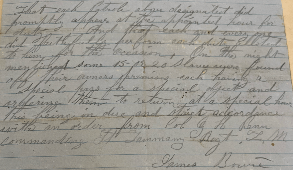 For example, Captain James Bowie details his night patrol in Covington, LA, in 1862. He begins by stating that “each patrol… did promptly at the appointed hour for duty.” He then goes on to detail his encounter with “some 15 or 20 slaves… found off their owners’ premises.” Issued reports were standard for patrol captains from the development of the slave patrols until the eventual dissolution following the Civil War.