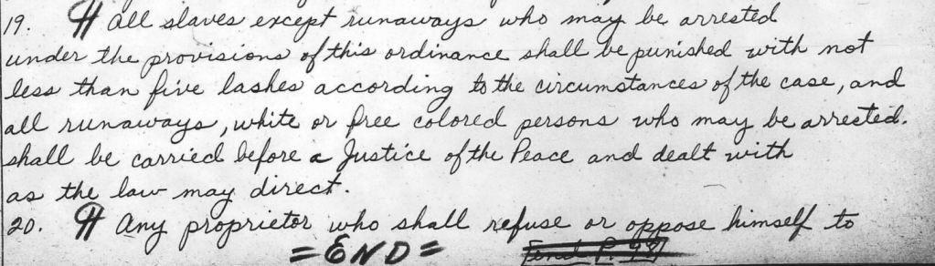 Other ordinances heavily controlling the autonomy of enslaved people prohibited the assemblage of slaves outside of the plantation of their respective owner. Additionally, the owner would be permitted to pay a fine “of not less than twenty-five nor more than one hundred dollars.” The last provision likely provided incentive for enslavers to more stringently oversee their slaves and prevent the likelihood of insurrection. Generally, enslaved people were not authorized any autonomy. However, by the 1860s, they were expected to be supervised without surcease and were only permitted to the land of their enslavers.