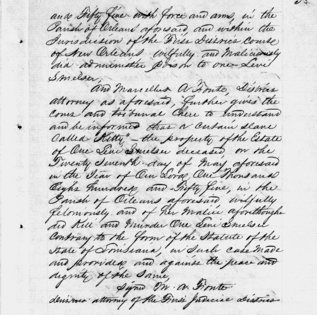 One example of these perspectives comes from Kitty, an enslaved woman from New Orleans who was sentenced to life imprisonment for poisoning her slaveholder, Levi Smelser. The poisoning reportedly occurred in May of 1855, but Kitty was not arrested for the crime until July. She confessed to a neighbor that she was put up to the poisoning by Mrs. Smelser and Adam Scott, a man Mrs. Smelser was having an affair with. Eventually, Scott and Mrs. Smelser were also arrested, and all three individuals were arraigned together on August 7th.