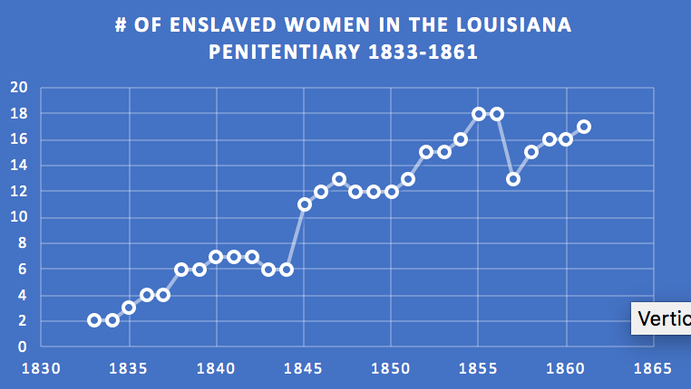Between 1833 and 1861, at least 35 enslaved women were imprisoned within the Louisiana State Penitentiary located in Baton Rouge.The majority of these women had received life sentences for a variety of crimes. However, to many of these women, confinement in the Penitentiary was a new, but not unfamiliar, form of bondage.