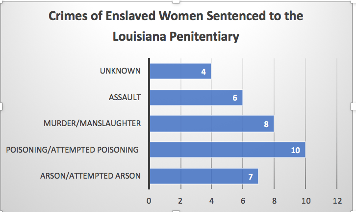 The majority of enslaved prisoners had been sentenced to life imprisonment as an alternative form of punishment for capital offenses. According to Louisiana’s Black Code, a slave could be convicted of a capital crime for anything from murder to arson to simply striking a white person. The majority of enslaved women sentenced to the Penitentiary had been convicted for either arson or poisoning, two of the most common forms of resistance among enslaved women.