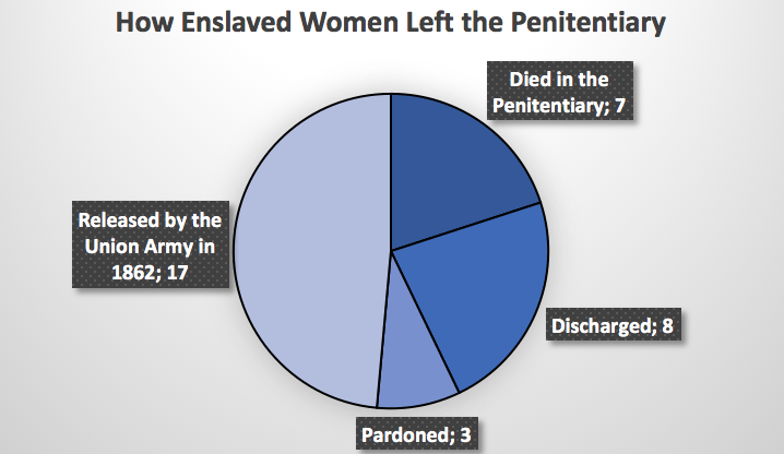 The majority of enslaved women imprisoned within the Penitentiary received life sentences and remained in the Penitentiary until the Civil War. However, between 1833 and 1861, eleven enslaved women were released from the Penitentiary.